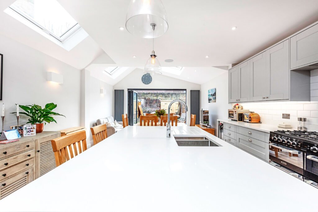 With the highest point completely off-centre, this extension features a large concertina sliding door leading the visitor from the front of the house to the backyard. This modern renovation features more classic materials and colours, giving it a timeless appearance.