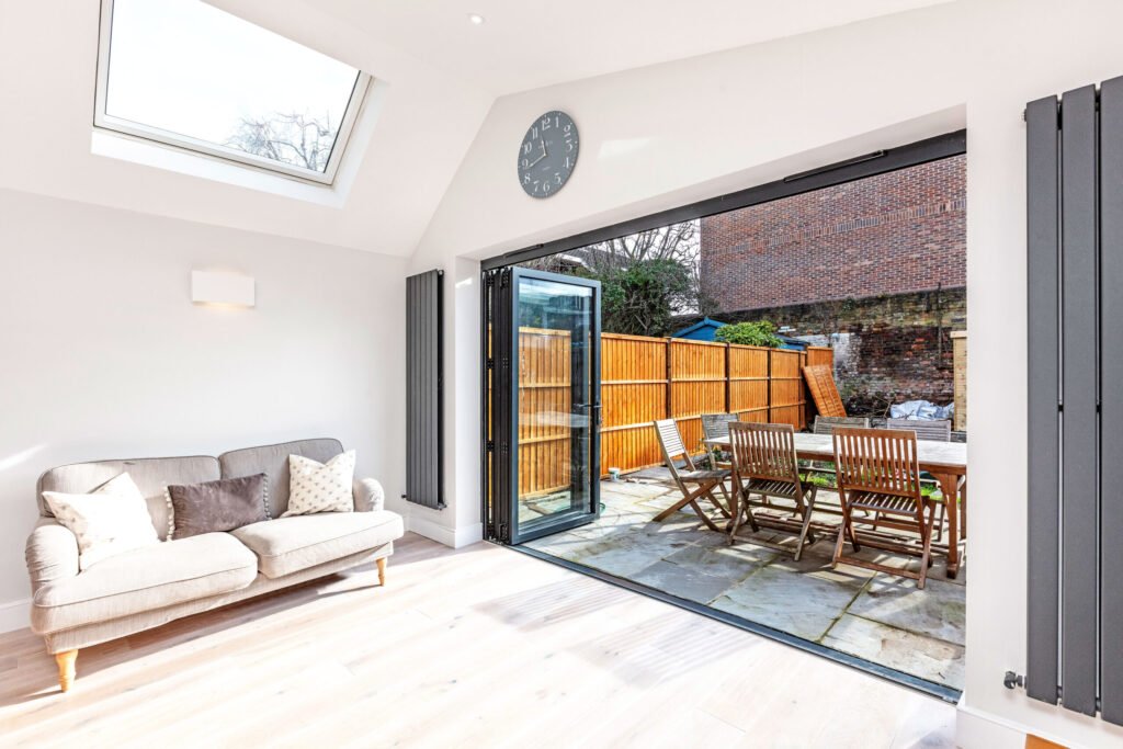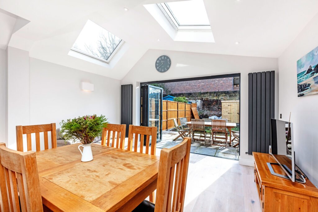 The dining area is located right off the kitchen, and the living area opens up to a sizeable backyard. The kitchen, dining area, and living area are all illuminated by skylights, which add natural light to the space. To maximise the wall space, dark grey tall radiators are making the most of the space placed on either side of the folding door.